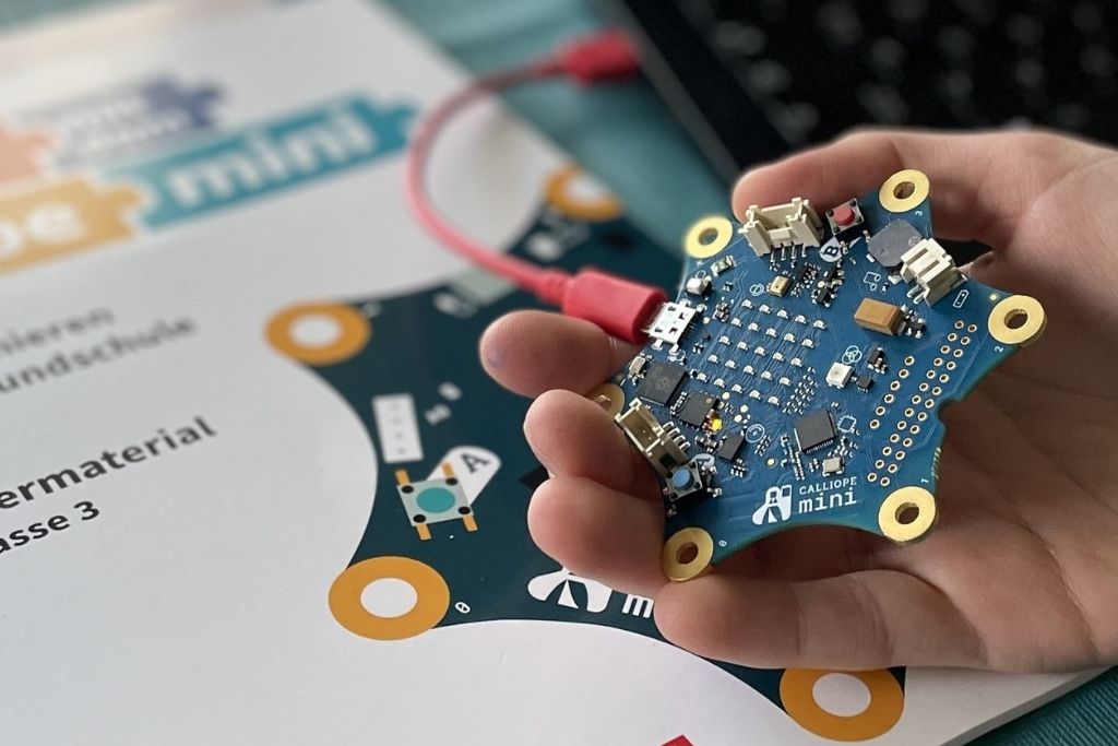 The extracurricular offering “Calliope Mini” was created as a joint project of various companies, including SAP and Siemens, with funding from the BMWF. The Open Roberta programming platform (freely available) is used for building block-oriented programming. Many schools already have a class set of educational materials for kids and teachers, alternatively it can be funded through GTA funds. It is very suitable for third and fourth graders. In order to offer a “Calliope Mini” program, elementary schools also need an equipped computer cabinet with a projector and Internet connection.