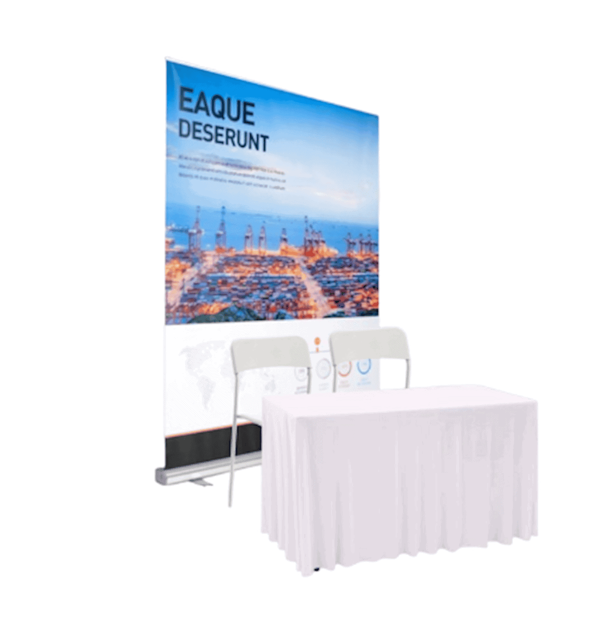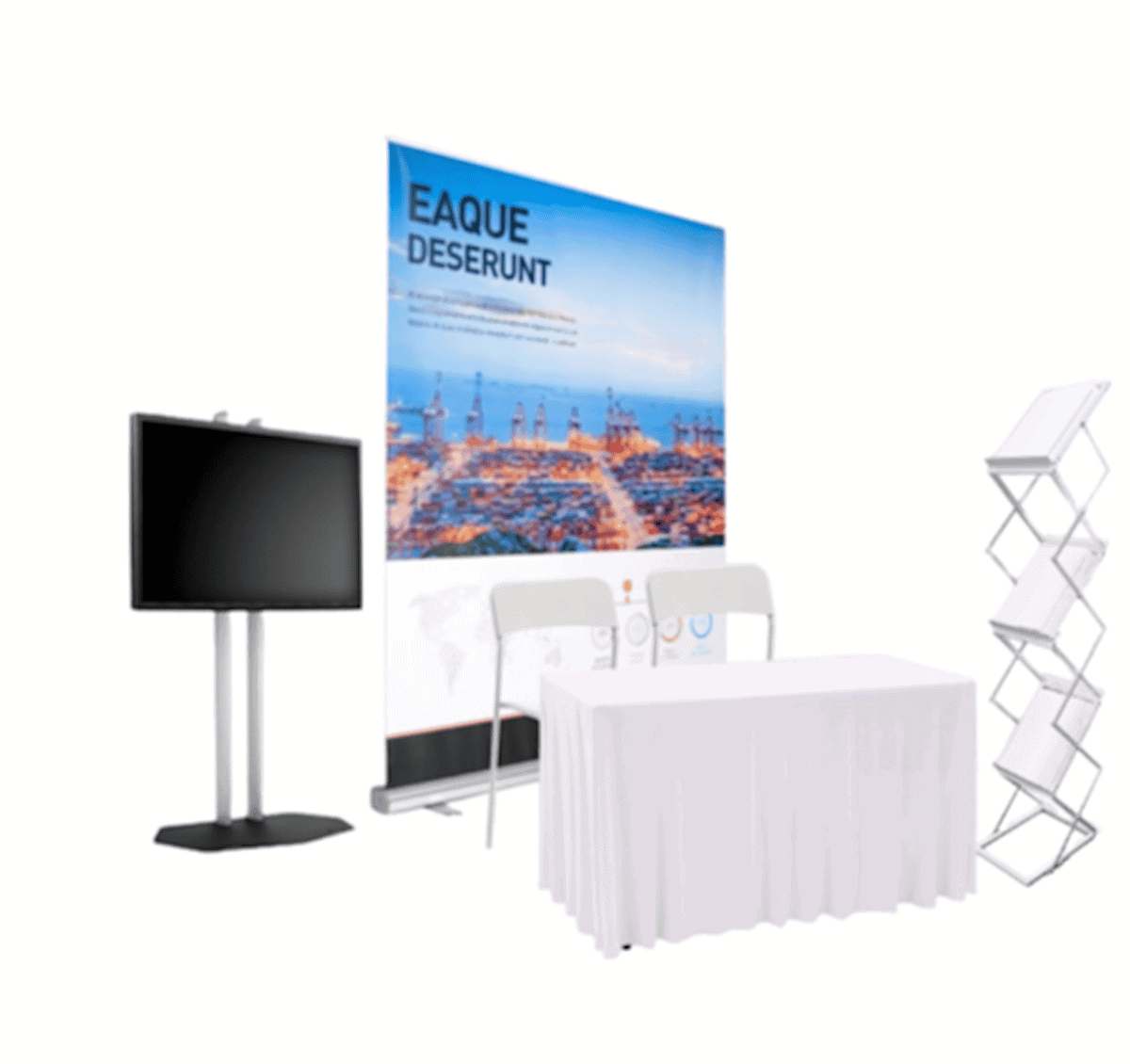 - Exhibition space including XXL roll-up banner (with your own graphics), 1 table, 2 chairs, monitor with stand, brochure stand, and power connection