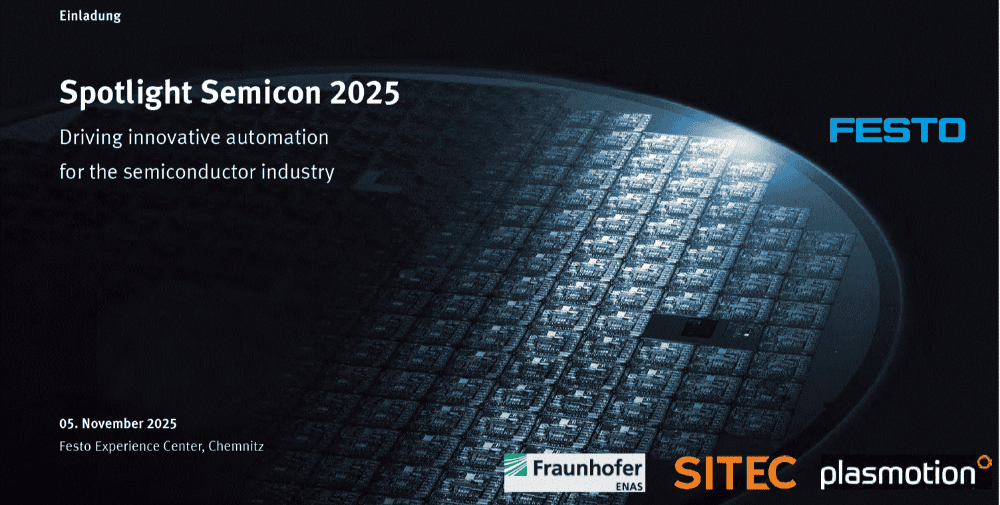 WorkshopSpotlight SemiconAus- & Weiterbildung | Automatisierung | Cloud | Digitalisierung | Elektronik | Forschung & Entwicklung | Halbleiter | Industrial Internet of Things | Konnektivität | Künstliche Intelligenz (KI) | Maschinen- & Anlagenbau | Packaging | Produktion | Reinraum | Robotik | Sensorik05.11.2025 09:0005.11.2025 15:00Festo Vertrieb GmbH & Co. KG Wildparkstraße 1a 09247 Chemnitz