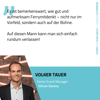 Als professioneller Moderator mit viel Erfahrung im IT- und Technologie-Bereich bringe ich genau das mit. Fachkenntnis und Verständnis für Dramaturgie und organisatorische Abläufe. Darum verlässt sich auch Silicon Saxony seit mittlerweile drei Jahren auf meine Unterstützung beim Silicon Saxony Day.