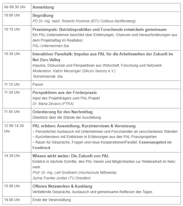 Auf der PAL-Transferveranstaltung am 26.08.2026 werden die Erkenntnisse des PAL-Projektes allen Interessierten vorgestellt. Unter dem Thema „Intelligente Assistenz am Arbeitsplatz der Zukunft“ werfen wir gemeinsam einen Blick in Vergangenheit, Gegenwart und Zukunft. Freuen Sie sich auf ein abwechslungsreiches Programm und erfahren Sie, wie es nach dem Projektende weitergeht.